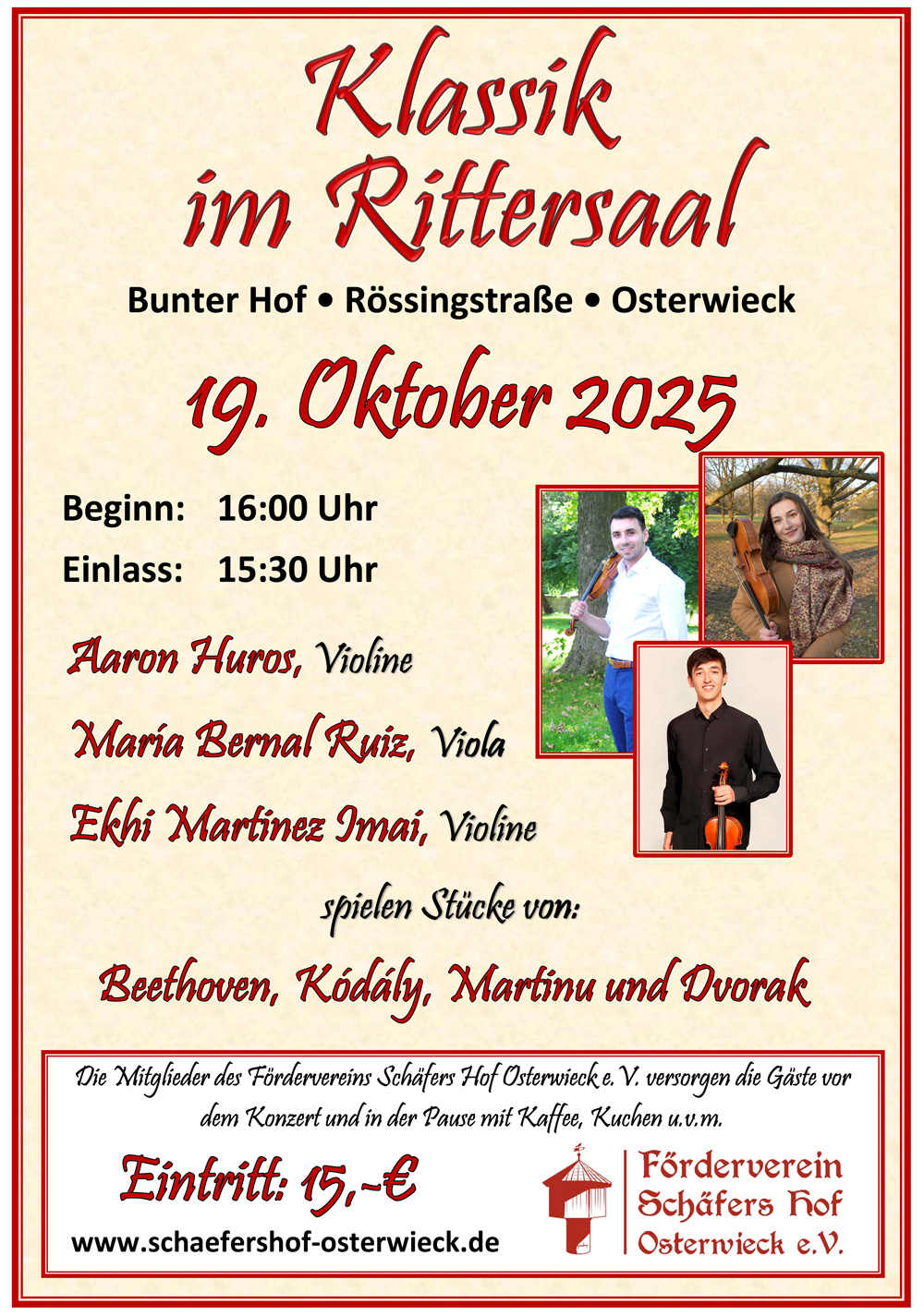 In dem gut einstündigen Programm spielen neben Aaron Huros (Violine) Ekhi Martinez Imai (Violine) und María Bernal Ruiz (Viola) Stücke von Ludwig van Beethoven, Zoltán Kódály, Bohuslav Martinu und Antonín Dvorak und versprechen den Besucherinnen und Besuchern ein abwechslungsreiches und unterhaltsames Konzerterlebnis.